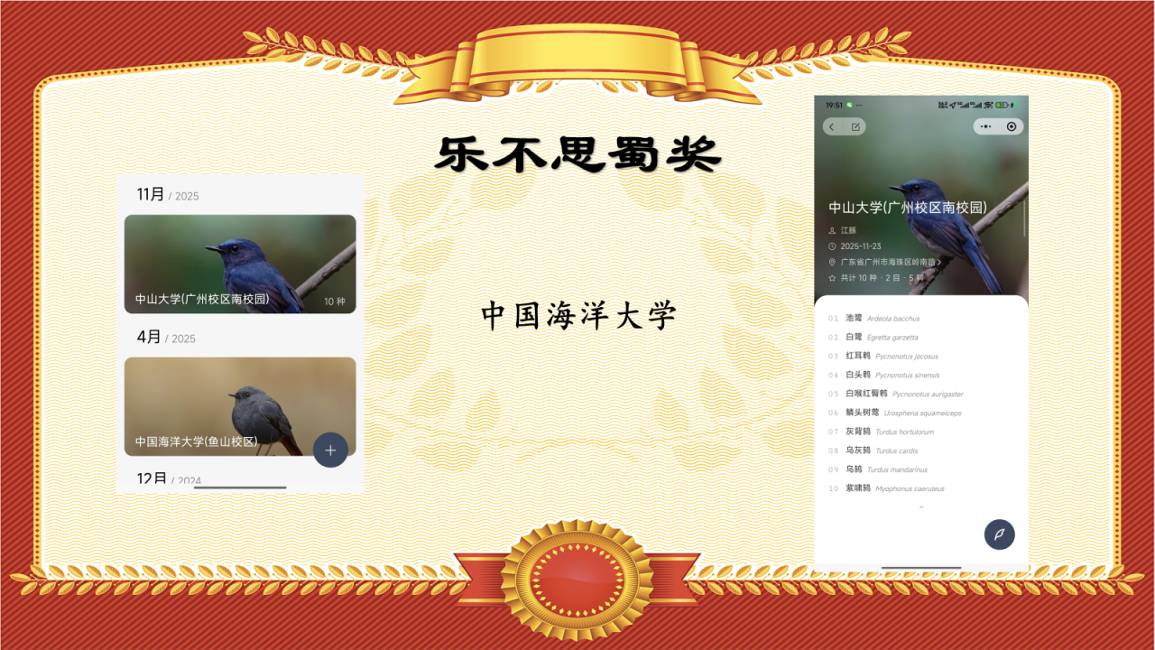 中国海洋大学的江豚老师,今年秋季鸟赛来到了成人直播APP 南校园助战,贡献了不少鸟种纪录,授予“乐不思蜀奖”!