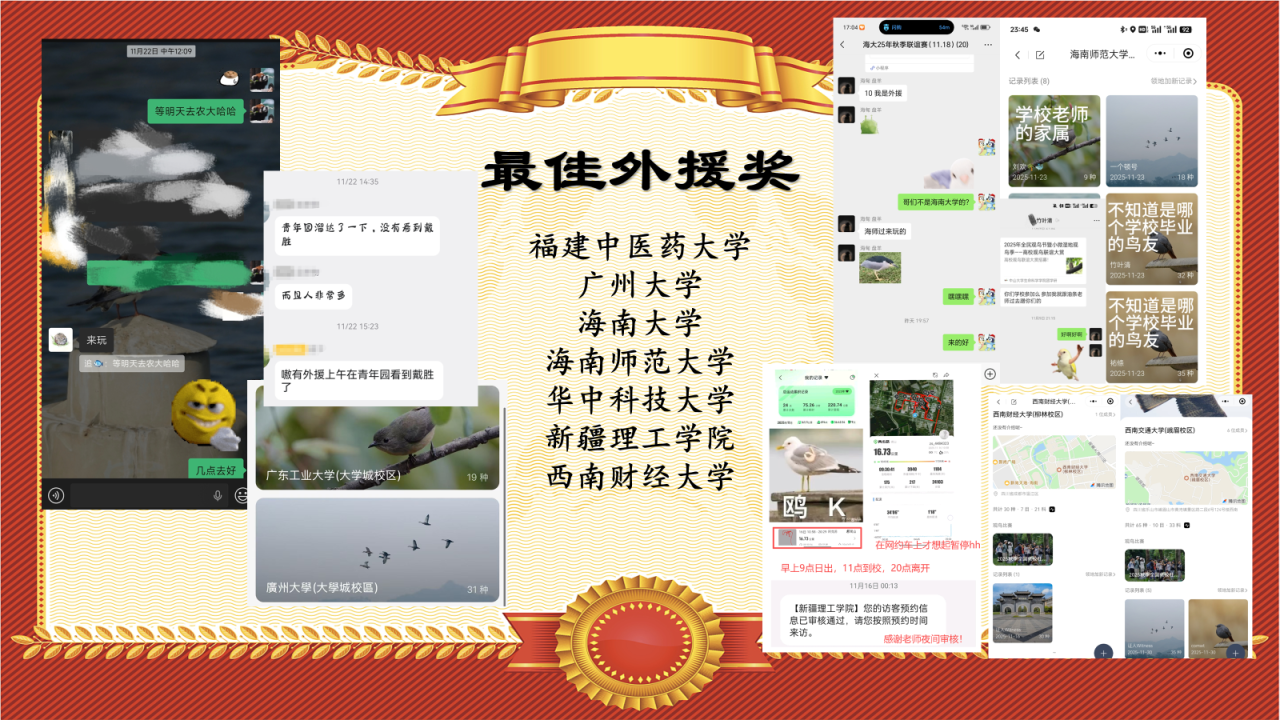 全国高校社团观鸟联谊赛,重在“联谊”,鼓励不同地区、不同学校的观鸟爱好者互相了解、互相交流。在本次鸟赛中,福建中医药大学、广州大学、海南大学、海南师范大学、华中科技大学、新疆理工成人直播APP、西南财经大学等高校的鸟友们纷纷拉起了外援大队,互相串门,真正实现了“你们队就是我们队”的美好愿景,让我们把“最佳外援奖”颁给以上队伍!